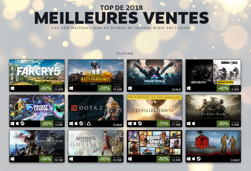Deux jeux de Valve dans le top de sa propre plateforme, plus les royalties de tout les autres jeux... Pas mal, même si de nouveaux acteurs veulent leur part avec l'arrivée d'Epic games store, Legion game store de lenovo et wegame de tencent tout 3 arrivés en 2018, curieux de connaître ce qu'il va se passer pour l'année qui vient !
