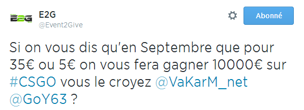 Contacté par nos soins, l'association a donné plus de détails dont notamment le lieu et le contexte. La capitale, Paris devrait ainsi être le théâtre de cet événement qui pourrait s'apparenter à des finales du circuit de la Fédération Française de Jeu Vidéo, également organisé par E2G. Il est important de noter qu'un tweet similaire mais concernant League of Legends cette fois-ci, a aussi été publié.