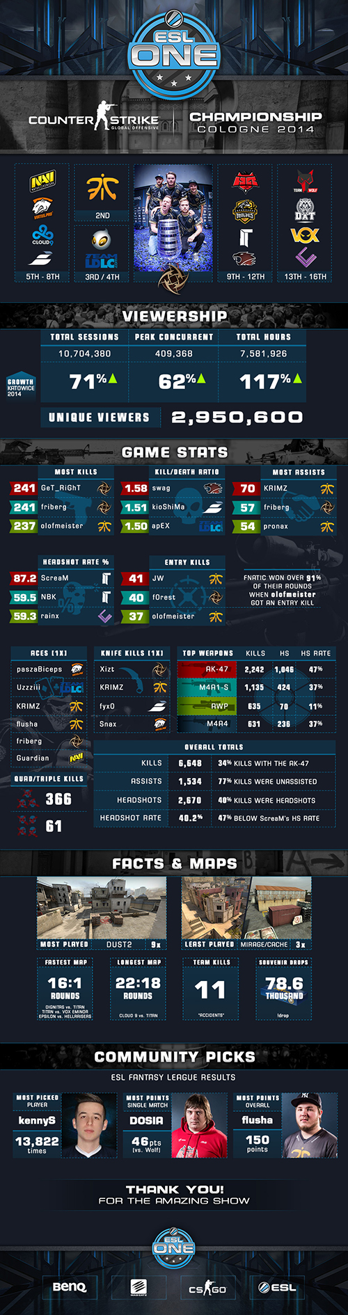 14 Cinq mois après le succès des EMS One Katowice, l'ESL retrouvait à Cologne la communauté CS:GO pour un deuxième tournoi majeur réunissant les meilleures équipes du monde. Un événement qui a une fois de plus explosé les compteurs laissant sans voix beaucoup d'observateurs. Comme pour Katowice, l'ESL a publié une infographie mettant en avant plusieurs statistiques.