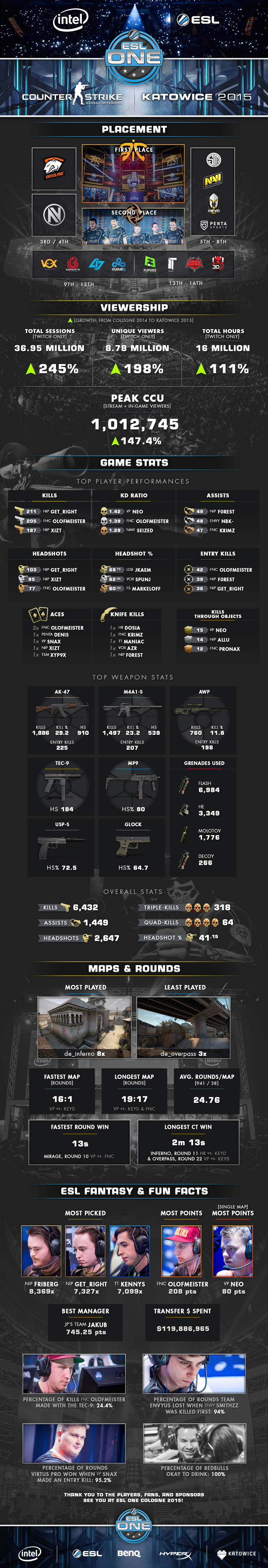 34 Comme pour les autres majors made in ESL, l'organisation allemande dévoile les statistiques de l'événement quelques semaines après son tournoi. Ainsi après les EMS One Katowice 2014, les ESL One Cologne 2014, c'est au tour des ESL One Katowice 2015 d'avoir le droit à leur infographie personnalisée.