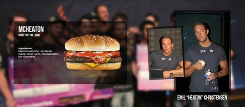 Aujourd'hui, les résultats de l'édition 2014 sont tombés et si nous savions que deux burgers aux "racines esportives", le McFragbite et le McHeatoN faisaient partie des finalistes, c'est bien ce dernier qui a été sélectionné et qui sera donc exclusivement commercialisé dans les restaurants suédois à partir d'aujourd'hui et durant une semaine. Le créateur de ce burger du nom d'Arvid Gullberg est bien sûr un fan de la légende de CS et a choisi du bacon, du boeuf et une sauce piquante pour représenter son idole qui aurait d'ailleurs déjà goûté le tout et l'aurait très apprécié.