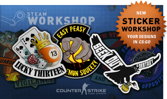 14 Quatre mois plus tôt le WorkShop s'étendait aux skins d'armes et depuis 26 habillages créés par la communauté sont disponibles en jeu, dans les caisses Winter Offensive et Opération Phoenix. Entre-temps les premiers autocollants sont apparus à l'occasion de la DreamHack Winter 2013 fin Novembre, depuis une nouvelle collection peut être obtenue via des capsules.