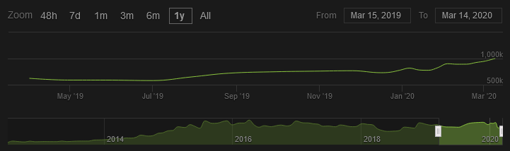 16 C'est fait ! Après un mois de février déjà record en nombre de joueurs moyens, la barre du million de joueurs simultanés sur Counter-Strike: Global Offensive a été franchie ce 14 mars 2020. Le record s'est précisément établi à 1 001 756 joueurs selon SteamCharts.