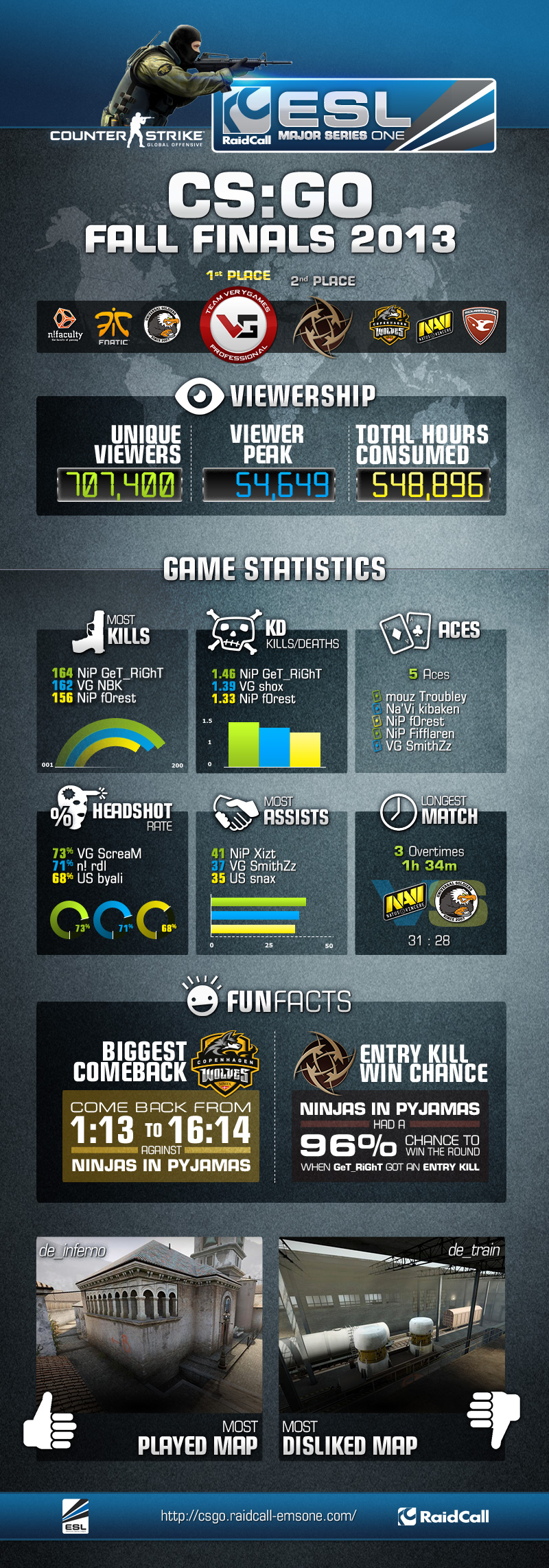 38 L'ESL vient de dévoiler une infographie instructive sur les EMS One Fall 2013. On y apprend par exemple que CS:GO a rassemblé 707 400 spectateurs uniques, que ScreaM a tué 73% de ses adversaires avec un headshot ou encore que SmithZz fait partie des cinq joueurs ayant réalisé un fullteam durant les finales de cette compétition.