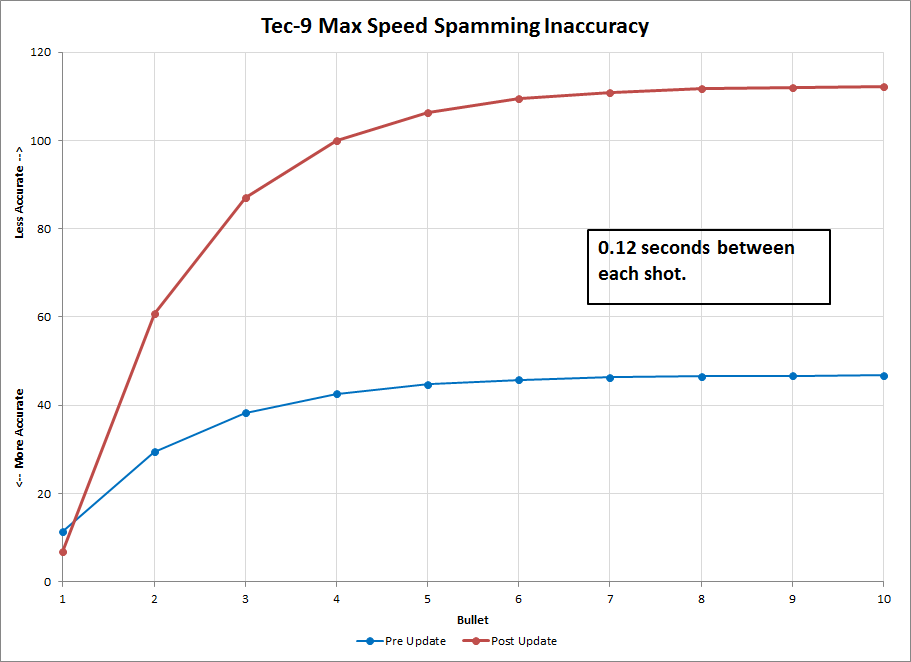 En bleu, la précision de chaque balle du Tec9 avant la mise à jour, avec 12 centièmes de seconde entre chaque balle ; en rouge, la même chose après la mise à jour. Plus la valeur est haute, moins c'est précis.