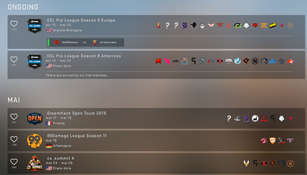 Deuxième ajout important, un planning compétitif est désormais directement intégré au jeu. En cliquant sur le bouton "Regarder les matchs et tournois" à gauche dans la page d'accueil, vous arrivez sur un écran vous indiquant toutes les compétitions professionnelles à venir ainsi que les éventuels matchs en cours. Chaque tournoi propose également un lien direct vers HLTV afin d'avoir plus d'informations dessus. Une sacrée bonne idée pour faire le lien entre les joueurs occasionnels et l'esport.