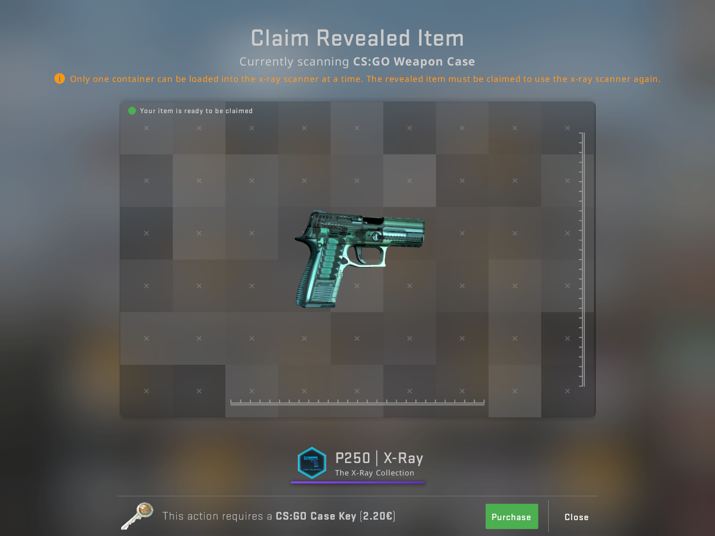Pour répondre à cette inquiétude, Valve à donc décidé de lancer le X-ray Scanner (sous forme de p250 X-ray) qui permet tout bonnement de savoir à l'avance ce qui se trouve dans une caisse de skin. Vous l'aurez évidement compris, le p250 en lui-même est payant (2,20€) et il ne permet de scanner qu'une caisse à la fois (ladite caisse scannée n'apparaissant plus dans l'inventaire). À chaque scan, vous devrez soit ouvrir (avec une clé bien sûr) la caisse, soit vous ne pourrez plus en ouvrir du tout. Le p250 scanner ne pouvant être réutilisé que si la caisse précédemment scannée a été ouverte. Malin non ?