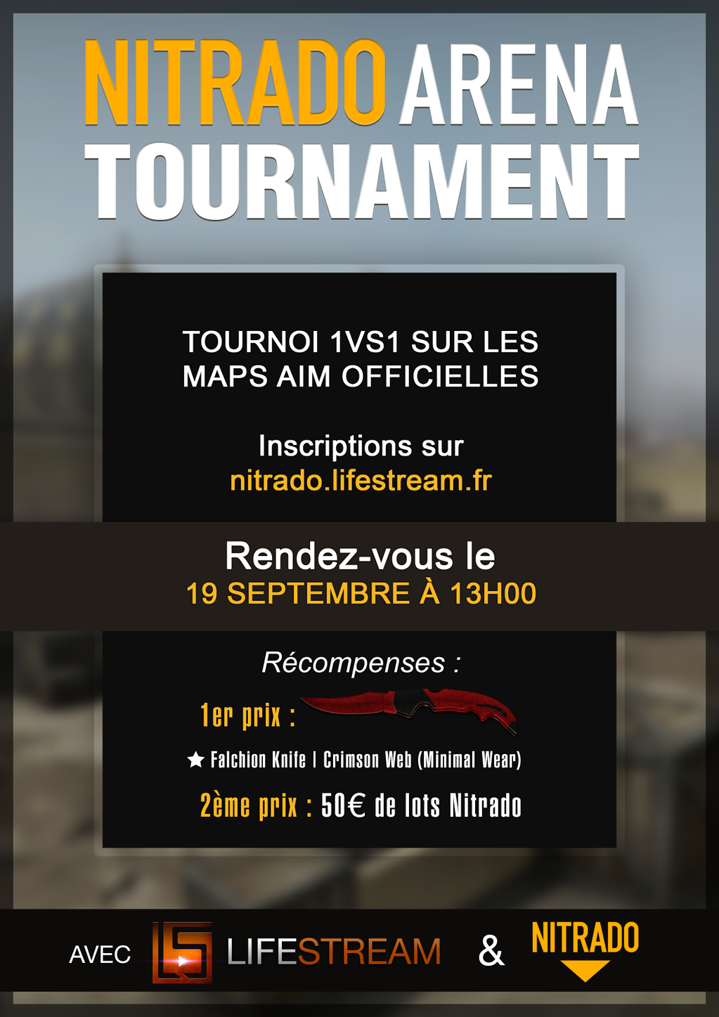 Initialement prévu pour regrouper 32 joueurs, Kan4 a augmenté le nombre de places disponibles jusqu'à 64 afin de rendre la compétition encore plus intéressante. L'ensemble des matchs se dérouleront en MR10 (le premier à 11 gagne) et les finalistes du tournoi remporteront des lots, le vainqueur repartira avec un skin de couteau tandis que le vaincu repartira avec 50€ de lots chez Nitrado, le partenaire du tournoi qui fournira deux serveurs et un TeamSpeak afin que celui-ci se déroule correctement. La compétition sera bien évidemment retransmise sur la chaîne CS:GO de Lifestream en compagnie de Kan4 et Vinzz. Enfin, si vous souhaitez participer, cela se passe par ici, mais dépêchez-vous car la moitié des places ont déjà été prises.
