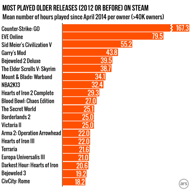 Global Offensive atteint même la tête du classement des jeux les plus joués sortis avant 2013, avec une moyenne de 167 heures par joueur. A noter que dans ce cas, la liste ne concerne que les titres regroupant plus de 40 000 joueurs.
