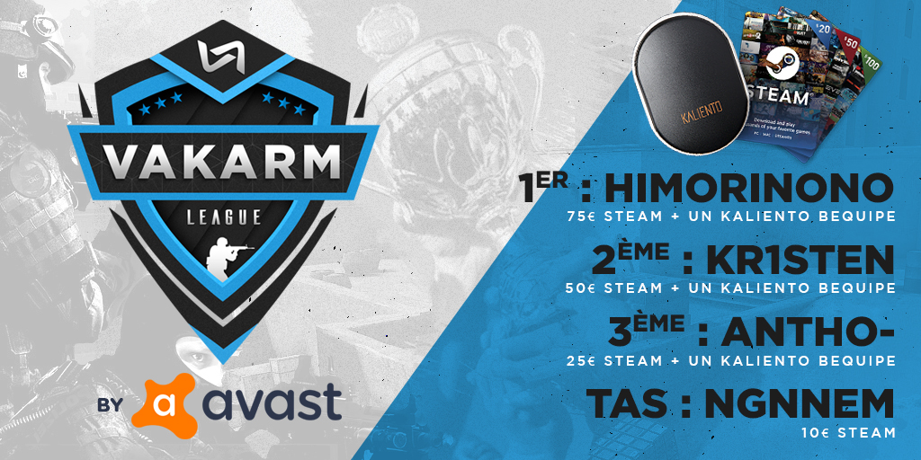 4 Le mois de décembre 2018 a vu la quinzième saison de VaKarM League by Avast se dérouler. Himorinono, KR1STEN et aNTHO- étaient les trois pseudos en haut du classement à la fin du mois. Le chauffe-mains Kaliento de Bequipe, les licences de protection d'Avast et les sous Steam sont donc pour eux, félicitations ! Concernant le tirage au sort, c'est nGnnem qui a été chanceux cette fois, bravo à lui également.