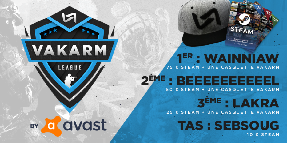5 Les saisons de VaKarM League by Avast s'enchaînent, une nouvelle dizaine approche et pour ce mois d'avril, c'est wainniaw qui se place sur la première marche devant BEEEEEEEEEEL, second, et LaKra, qui complète le podium. Chacun se verra offrir un peu de crédit sur Steam ainsi qu'un magnifique couvre-chef offert grâce à notre nouveau sponsor Headict. Sebsoug, quant à lui, n'a pas particulièrement brillé en match mais c'est grâce à sa chance qu'il remporte 10 € !