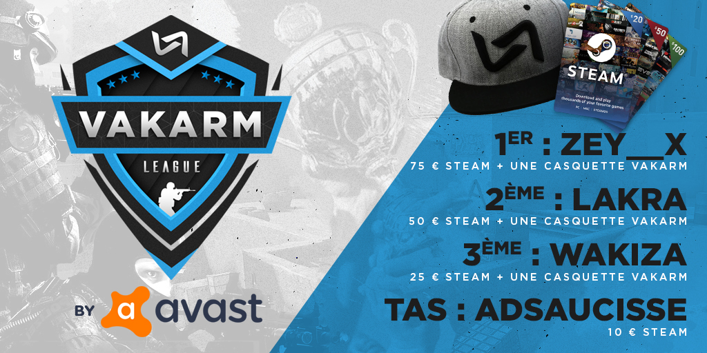 1 Vingt saisons de VaKarM League by Avast se sont écoulées, bientôt deux ans d'existence pour le hub ! Le mois de mai a vu Zey__X, LaKra, et Wakiza se hisser aux trois premières places du classement. Bravo à eux, ils remportent de l'argent pour Steam, une casquette VaKarM et une licence de protection Avast ! Le chanceux tiré au sort cette fois-ci, qui repart avec 10 euros Steam, est ADsaucisse.