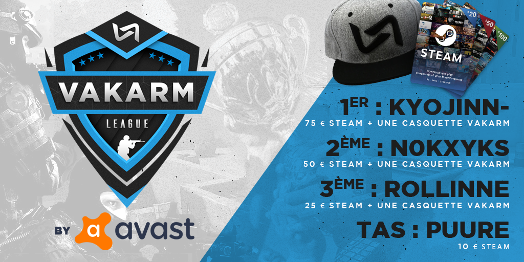 Bravo à Kyojinn-, n0kxykS et Rollinne qui finissent respectivement aux 3 premières places et gagnent des licences Avast, une casquette Headict siglée VaKarM ainsi que des sous sur steam.