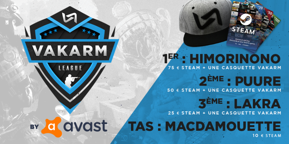 Félicitations à Himorinono qui finit premier de la league. La seconde marche du podium est occupée par puure, bravo à lui. Enfin, la troisième place revient à LaKra. Comme promis, les trois gagnants repartent avec une casquette Headict siglée VaKarM ainsi que des sous sur leur porte-monnaie Steam.