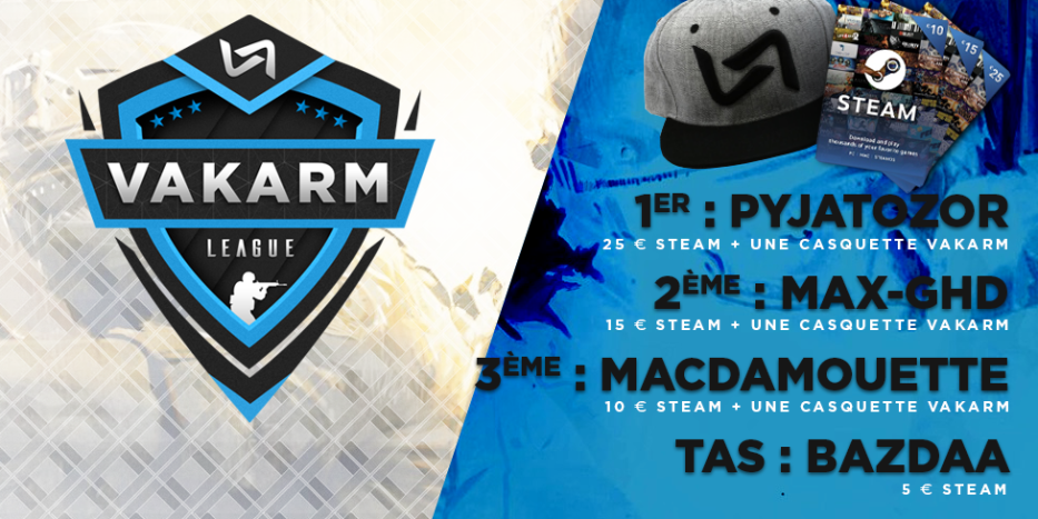 Félicitations à Pyjatozor qui finit premier de la league. La seconde marche du podium est occupée par Max-GHD, bravo à lui. Enfin, la troisième place revient à MacDaMouette. Comme promis, les trois gagnants repartent avec une casquette Headict siglée VaKarM ainsi que des sous sur leur porte-monnaie Steam.