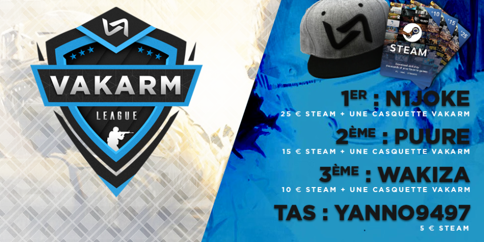 Félicitations à N1Joke qui finit premier de la league. La seconde marche du podium est occupée par puure, bravo à lui. Enfin, la troisième place revient à Wakiza. Comme promis, les trois gagnants repartent avec une casquette Headict siglée VaKarM ainsi que des sous sur leur porte-monnaie Steam.