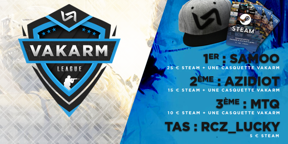 Félicitations à SamOo qui finit premier de la league. La seconde marche du podium est occupée par AZIDIOT, bravo à lui. Enfin, la troisième place revient à mTQ. Comme promis, les trois gagnants repartent avec une casquette Headict siglée VaKarM ainsi que des sous sur leur porte-monnaie Steam.