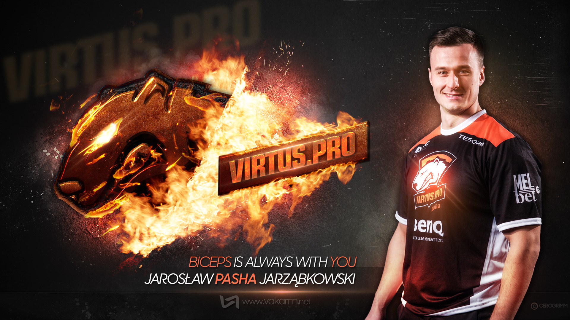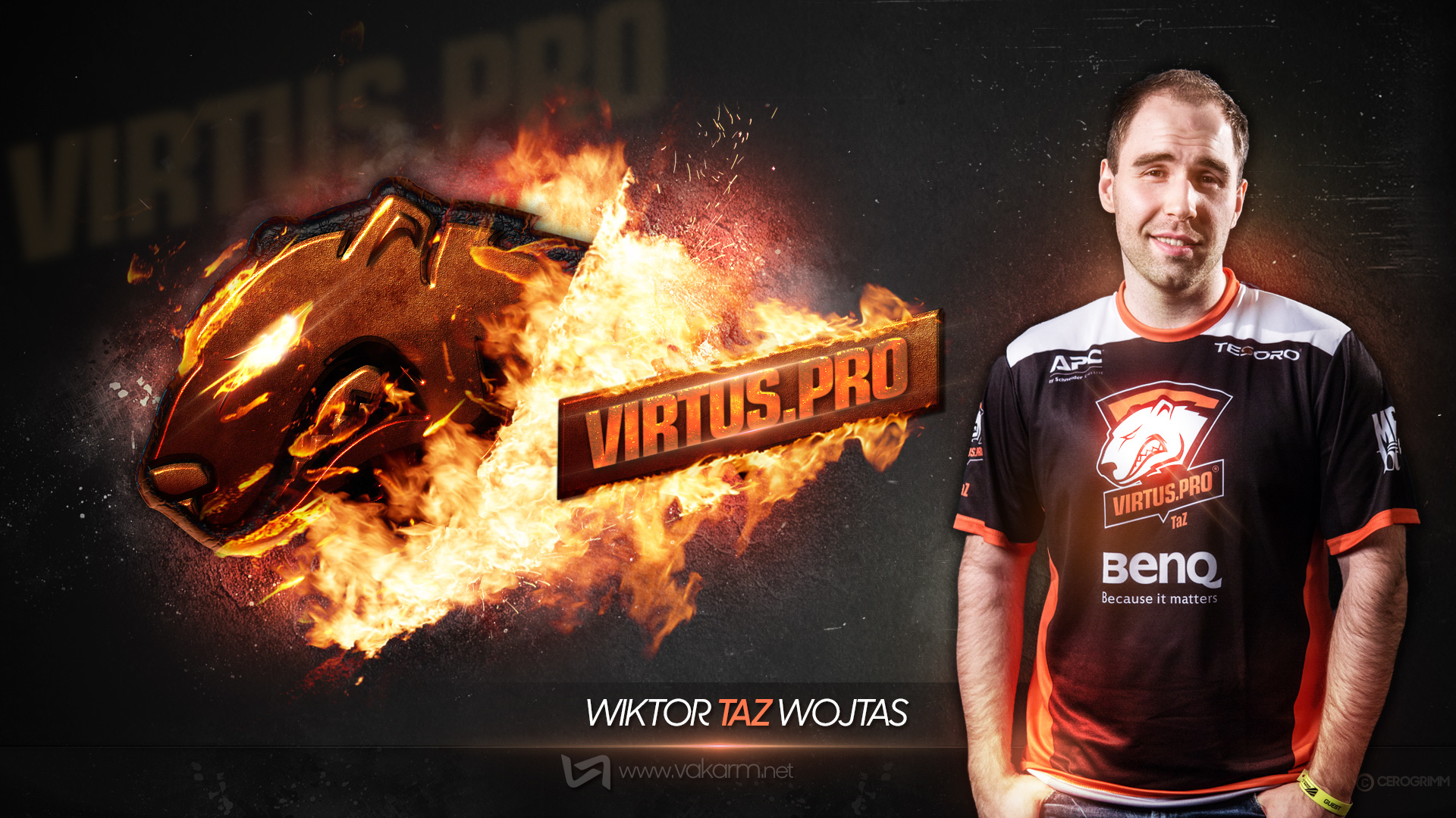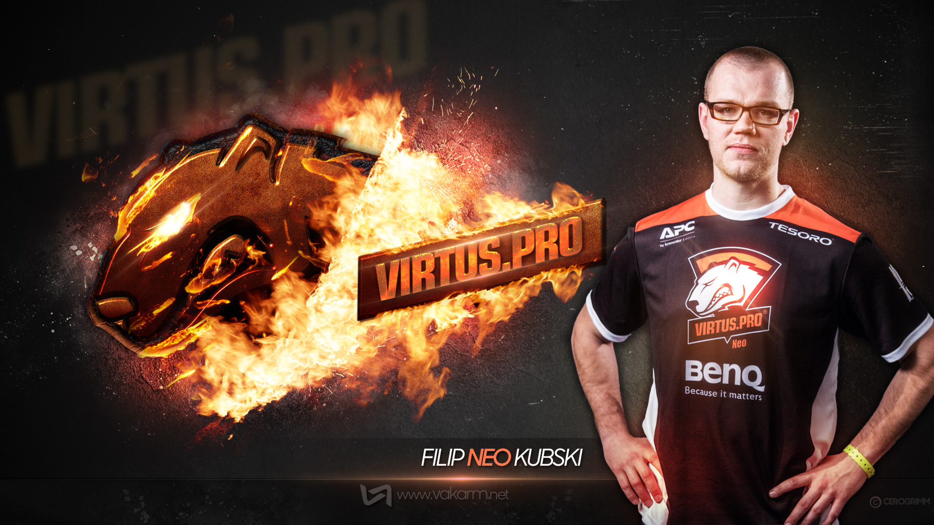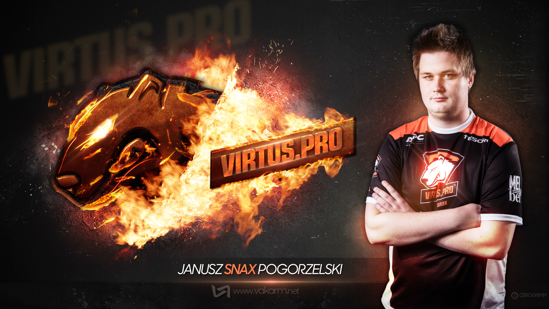 Pour cette première, c'est donc l'équipe Virtus.pro qui est mise à l'honneur. Au menu, notre graphiste Cerogrimm nous sert 6 créations, une par joueur et une pour le tag VP :