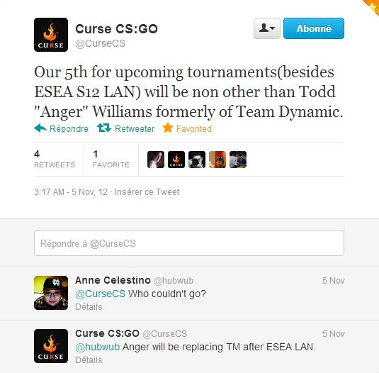 6 Remercié par l'équipe Dynamic il y a quelques semaines, Todd "anger" Williamsrepin rebondit de la meilleure des façons. Premiers de la saison régulière, les joueurs qui évoluent désormais sous les couleurs de Curse, ont décidé d'intégrer l'américain. Ce joueur qui était considéré comme l'un des meilleurs joueurs Source en Amérique du Nord est appelé afin de remplacer Zach "tm-" Miller. Ce remplacement ne devrait être effectif qu'après les finales lans des ESEA XII conformément au tweet de l'organisation :