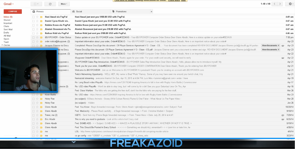 Alors qu'il était à la recherche d'informations concernant les dotations de son stream, Ryan "fREAKAZOiD" Abadir, ancien Dynamic, Frost Gaming ou compLexity, a laissé apparaitre son gmail personnel dans lequel était visible un échange de mail avec Jack Etienne, créateur de C9. Le sujet des mails étant "C9 Player Services Agreement" autrement dit un contrat de joueur.