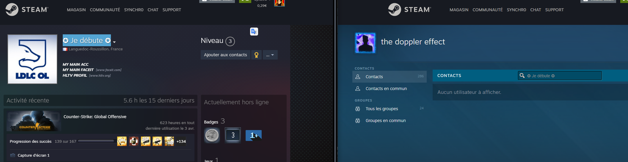 Le compte faceit n'est pas en lien avec son compte steam https://faceitfinder.com/profile/76561198845387769 Sur la 3e vidéo : Jamais tu prefires dans les escas lower car il pourrait n'y avoir personne et dans ce cas, tu n'aurais pas envie de révéler ta position. Perso, j'ai jamais vu un mec monter en elo et faire de plus en plus de frag ; surtout qu'il reste stuck nova/silver pendant 2 ans avec une moyenne de 15/20 frags. Plus évident, c'est difficile. |