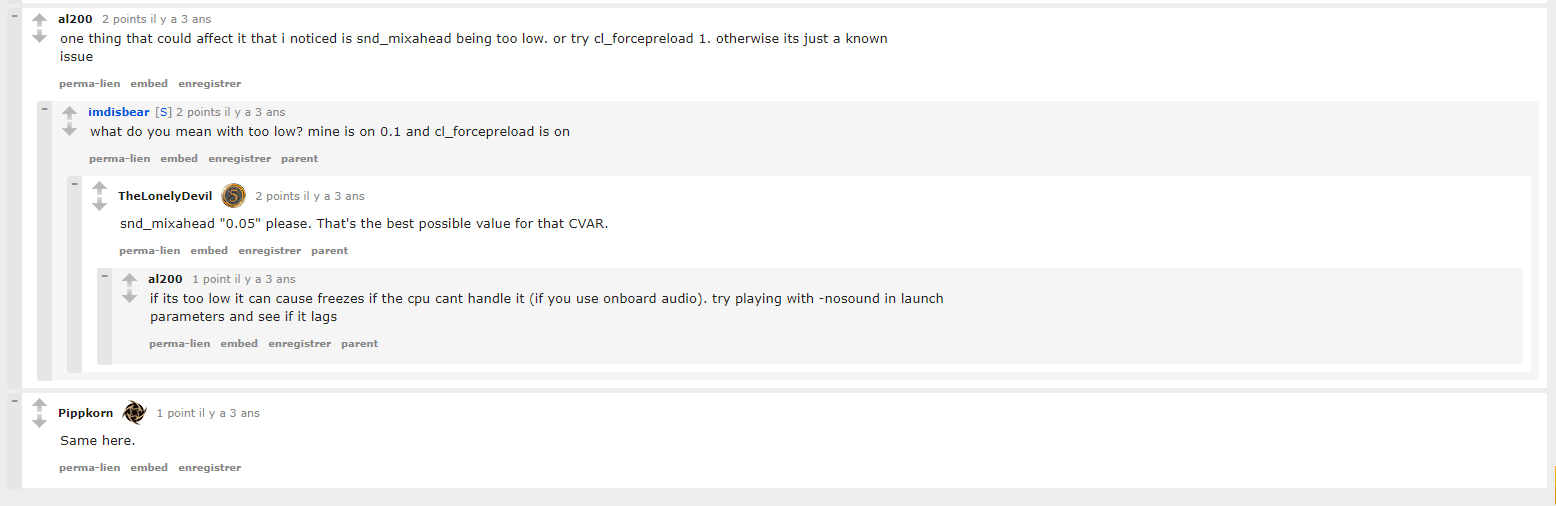 https://www.reddit.com/r/GlobalOffensive/comments/1xm50n/fix_for_fps_freeze/ https://i.gyazo.com/c18eab6f86aa9e5c1a9004f6dac4fc59.png j'ai trouvé ce post qui date un peu en gros mettez snd_mixahead a 0.05, perso le miens était a 0.025 je test et j'édit si y'a du neuf salut cette commande sert a quoi ? |