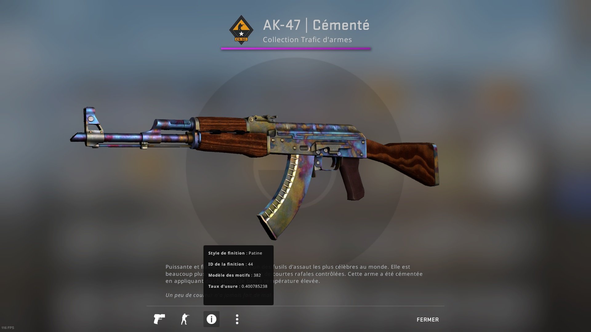 Bonjour, je sais absolument pas comment les patterns et tout marchent. Est ce que des gens auraient une estimation du prix de cette ak ? https://image.noelshack.com/fichiers/2019/37/7/1568500712-ak-47.jpg |