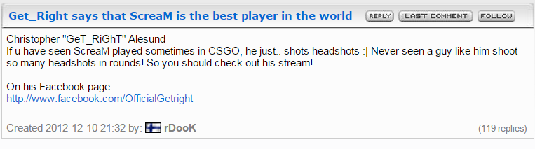 Depuis quand gtr a pleuré contre scream à cette époque mdrrrr gtr roulait tout le monde il n'a pas pleuré mais il avait dit que scream était la personne la plus compliqué a jouer pour lui (en 1vs1) et qu'il avait peur de prendre un fast hs sans pouvoir rien faire. L'interview était peut-être fin 2013 ou début 2014 je sais vraiment plus. sans le connaitre réellement il partageait son stream a l'époque imG "Never seen a guy like him shoot so many headshots in rounds" mais la mise a jour la un peu nerf, il re devient de plus en plus complet http://i.gyazo.com/87a660a0a84ee23800fb36a7e16957fb.png post:https://www.facebook.com/OfficialGetright/posts/256304867830990 |