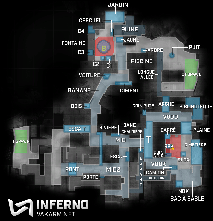 si vous jouez en anglais vous dites quoi? RUSH B SOUKA BLETTE !! Sinon pour moi vis a vis des poses données par vakarm en A leur NBK c'est mon quad et leur byali c'est mon NBK. Avec des potes on avait un crabe et un lapin sur d'autres maps alors que ça n'avait rien a voir. Pour les caisses en B j'ai entendu plusieurs fois totem. Et pour inf j'susi d'acc c'est intéressant, ya pas mal de joueurs anglais super cools et réactifs, bylaly est ce nbk? du coup mid cest sandbag, après bas vent bon bah vent tampis. par contre du coup tu pense avoir entendu nbk pour le byali de vakarm? parce que je m'emèle toujours, pour moi (en fr en tout cas) qu'on dise nbk ou quad ou fond site c'est le meme endroit. je crois avoir entendu plusieurs fois close right, mais ça m'étonnerait pas qu'ils aient un autre nom. --- après pour moi inferno le jaune de vakarm c'est jardin et pas jaune. et pour moi leur jardin c'est cimetière, : http://www.vakarm.net/files/battas/263174INFERNO.png . |