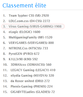 #21 Il est important pour cette équipe de se mesurer a de bonnes équipes françaises et européennes autrement qu'en Lan. Cela peut passer par une saison en EAS ou en se concentrant sur des praccs intensifs de qualité avec mise en place d'un jeu défini. Pour progresser, il sera également nécessaire pour la plupart des joueurs de faire preuve de d'avantage de constance selon moi. Cependant, il existe de nombreux joueurs à potentiel dans ce line up et si le leader in game alias As-T continue à évoluer, on peut rêver du meilleur pour cette équipe. #22 Non. DrZ a uniquement joué avec l'équipe pour la maXlan. Suite, aux nouvelles disponibilités de NwOo-, il a logiquement été remercié. #24 Il s'agit uniquement d'une vidéo humoristique montrant que l'équipe VIRUS ne se prend pas la tête (hormis in game parfois^^) car tous se connaissent très bien Commentaire modifie le 28/03/2011 00:00:21 par Helkern