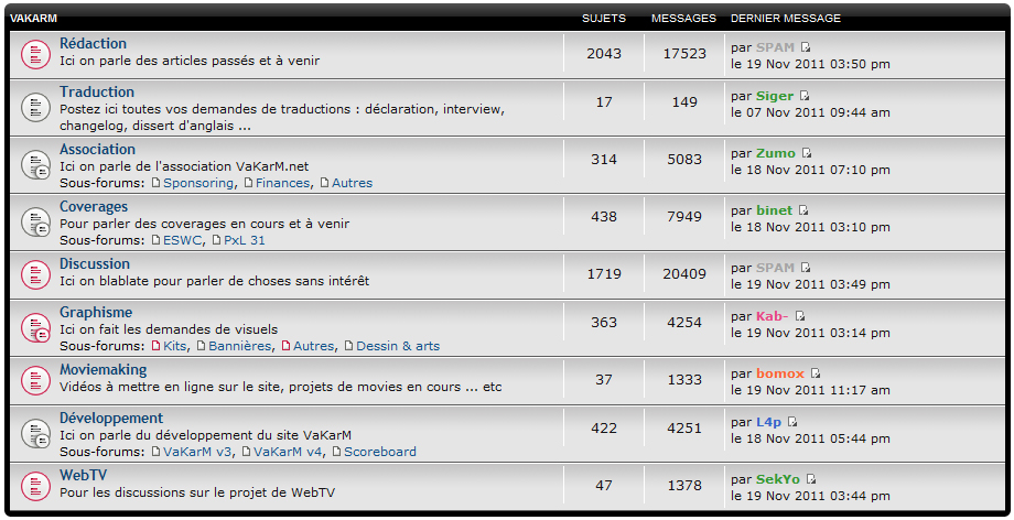 Par la suite, on clique sur l’onglet « Forum ». Le forum, c’est le cœur de vie et de l’organisation chez VaKarM. Lorsque l'on dispose des droits d’administrateur, une autre section se découvre. En plus des deux sections « Counter Strike : Source » et « Communauté VaKarM.net », s’ajoute la section « VaKarM ». Là, on y retrouve une petite dizaine de catégories :