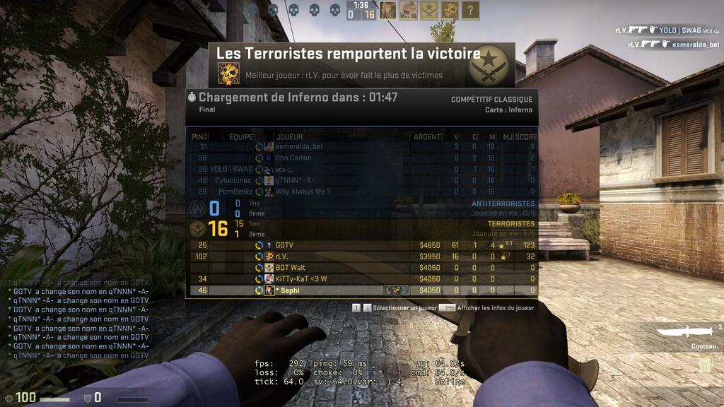 Après on ne l'utilise pas toujours en stream, parce que justement les kills ne sont pas toujours le plus important sur CS. Il vaut mieux parfois montrer le move d'un mec qui risque de mener à une belle action de sa part pour bien montrer d'où ça viens... Exemple, si des terros sont en train de faire une ouverture BP B sur inf depuis la banane, ils prennent un kill voir 2, l'autodirector te montrera ça, mais il te montrera pas le move du CT qui était en train de back up pour les prendre dans le dos et amener ainsi la reprise du BP qui mènera à la victoire de sa team. C'est pour ça qu'on rate parfois des actions sur la webTV, mais on essaye d'offrir aux spectateurs cette vision du jeu "globale" plutôt que de trop se focaliser sur les kills qui ne sont pas toujours beaux et qui apparaissent en haut à droite de toute façon. Après je dis pas qu'on y arrive bien (on a encore énormément de progrés à faire là dessus) mais c'est en gros l'optique qu'on veut donner à nos streams, et on s'efforce de progresser dans cette direction.