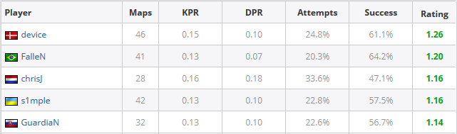 FalleN est un IGL d'exception et un sniper fou, mais aussi le meilleur lanceur de flash du top 30 monde en lan en 2018, avec un temps d'aveuglement moyen par round infligé aux ennemis de 2,96 secondes