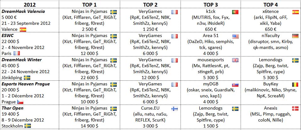 Difficile de donner la définition précise d'une "grande lan internationale". Ce tableau regroupe simplement des tournois significatifs qui se sont disputés entre 2012 et 2023, en termes de cashprize – un "gros cashprize" de 2013 n'étant évidemment pas comparable à son équivalent dix ans plus tard – et d'équipes en lice, ces dernières représentant le très haut ou le haut niveau mondial ou européen. Quant au terme "internationale", il veut dire que seules les compétitions regroupant des équipes d'au moins deux pays différents ont été comptabilisés.