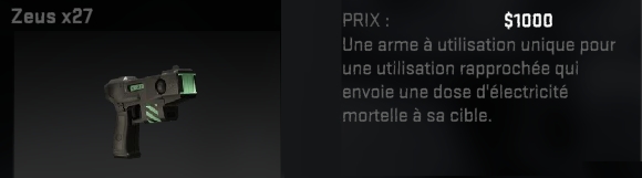 Disponible uniquement en mode casual le Zeus x27 est une réplique du fameux Taser. Présent dans la section équipement du menu d'achat, il coûte 1 000 $ et prend une place supplémentaire dans votre inventaire ce qui permet de conserver le pistolet. L'arme dispose d'une seule munition qui tue en un coup avec ou sans kevlar. A noter que la portée est très courte et qu'il faut donc être à moins de 5 mètres de son adversaire pour espérer lui envoyer une décharge électrique mortelle.
