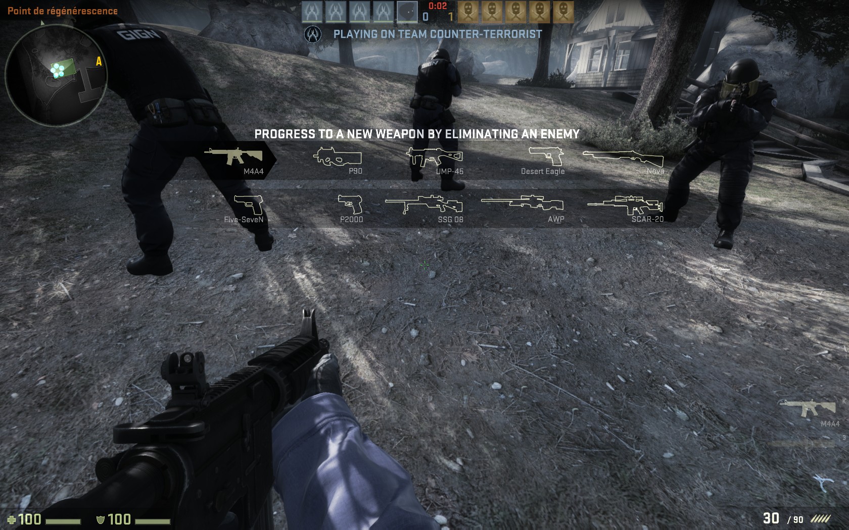 | Partie supérieure : le mini-scoreboard affiche le niveau de chaque joueur et l'arme du plus avancé sous son avatar pour le mode Arms Race (cliquez pour agrandir) |