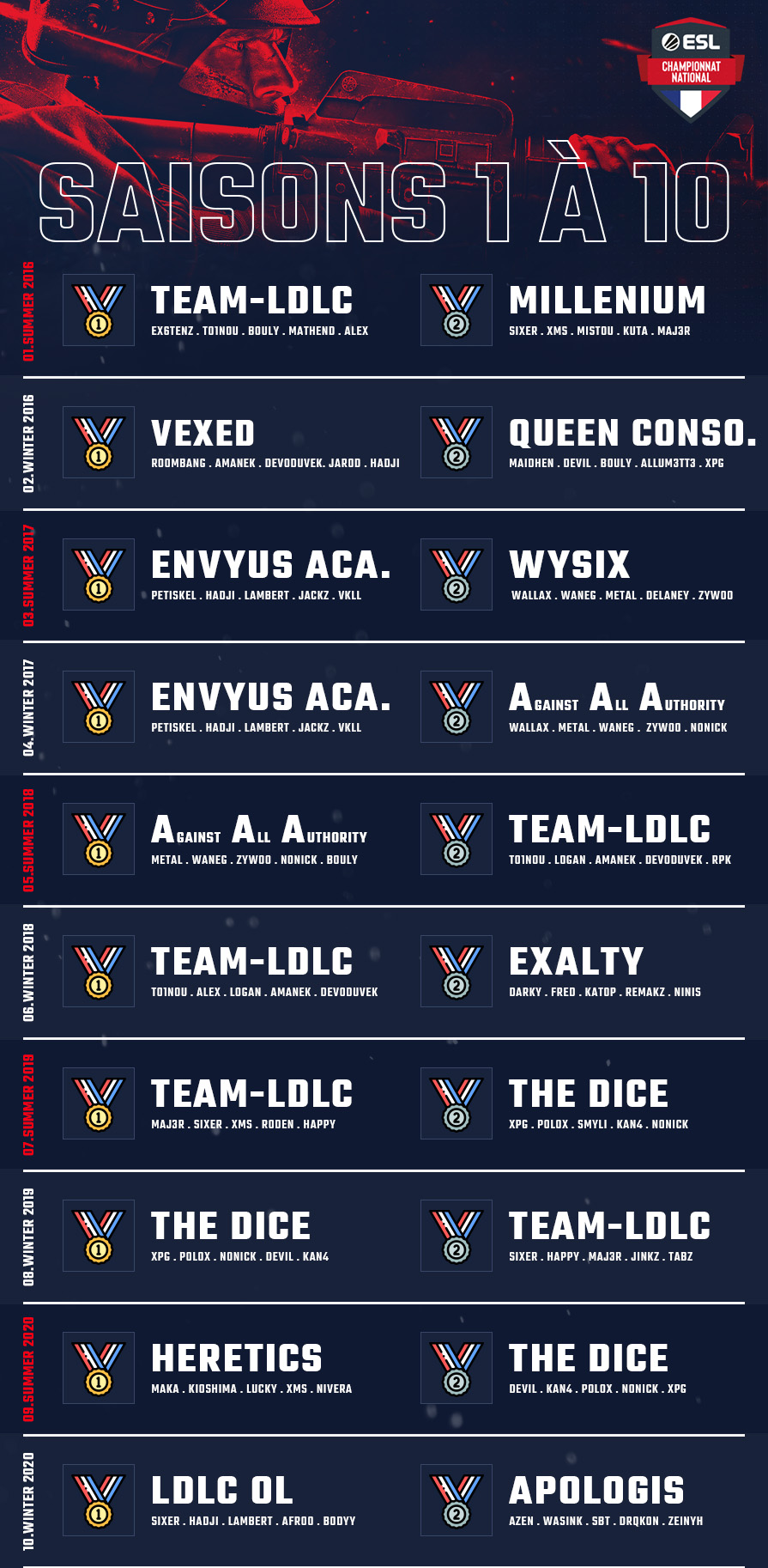 Pareil pour aAa en saison 5 : le titre semblait promis à LDLC, mais les hommes de waneG parvinrent à déjouer les pronostics en finale pour partir avec le plus gros chèque. Dans une moindre mesure, pas tout le monde n'aurait parié sur LDLC (SIXER, Lambert, hAdji, bodyy, afroo) lors de la saison 10, préférant plutôt miser sur Heretics ou TheDice. Las, ces deux derniers s'écrouleront en demi-finale et LDLC ira cueillir son quatrième succès dans la compétition.