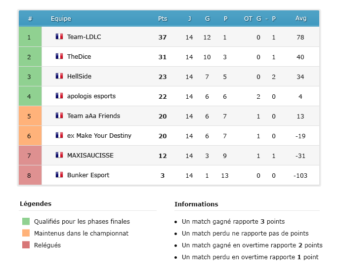 Dans le bas du classement Maxisaucisse et Bunker esport sont relégués dans la division 2 du championnat national.
