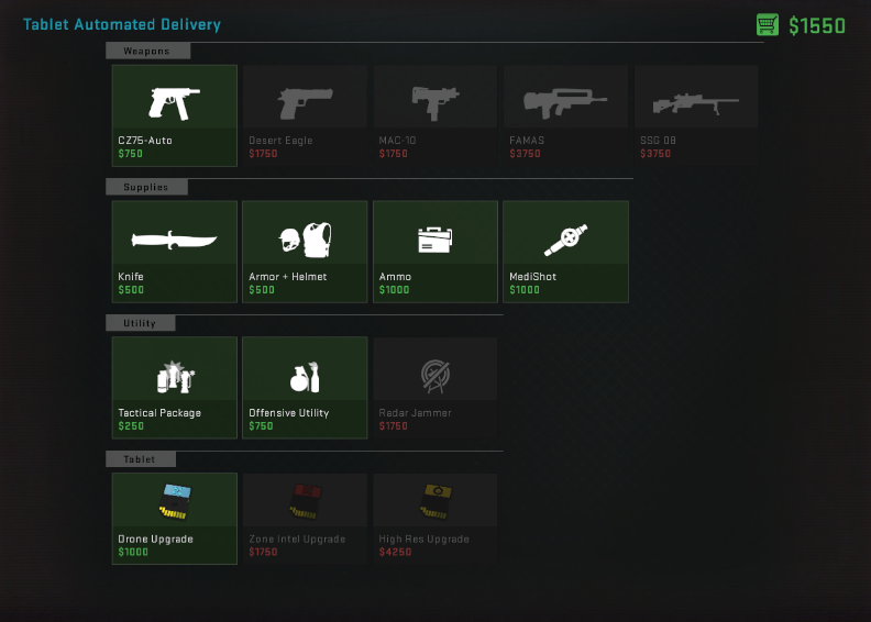 La tablette vous permet aussi d’avoir accès à un menu d’achat (en appuyant sur "B" par défaut). L’argent que vous récolterez vous permettra ainsi d’acheter des équipements qui vous seront ensuite livrés par votre drone. Dans ce menu, vous pourrez notamment acheter des armes, avec des sets différents selon les parties :