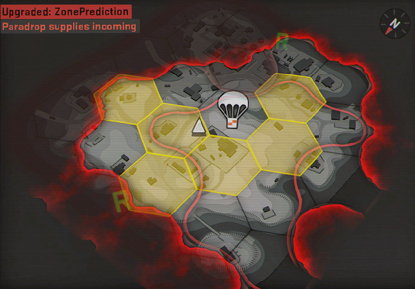 La carte à un niveau de jeu déjà un peu avancé : des colis sont parachutés, et la zone de jeu est en train de se réduire.
