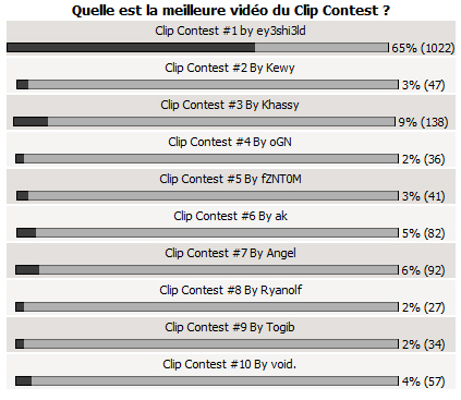 Sérieux quand je voit des trucs genre "Clip Contest #10 By void." Alors que t'a http://www.youtube.com/watch?v=NtpWooje8uc qui est pas pris ... Gl à Ak et Khassy qui sont les deux meilleurs selont moi :).