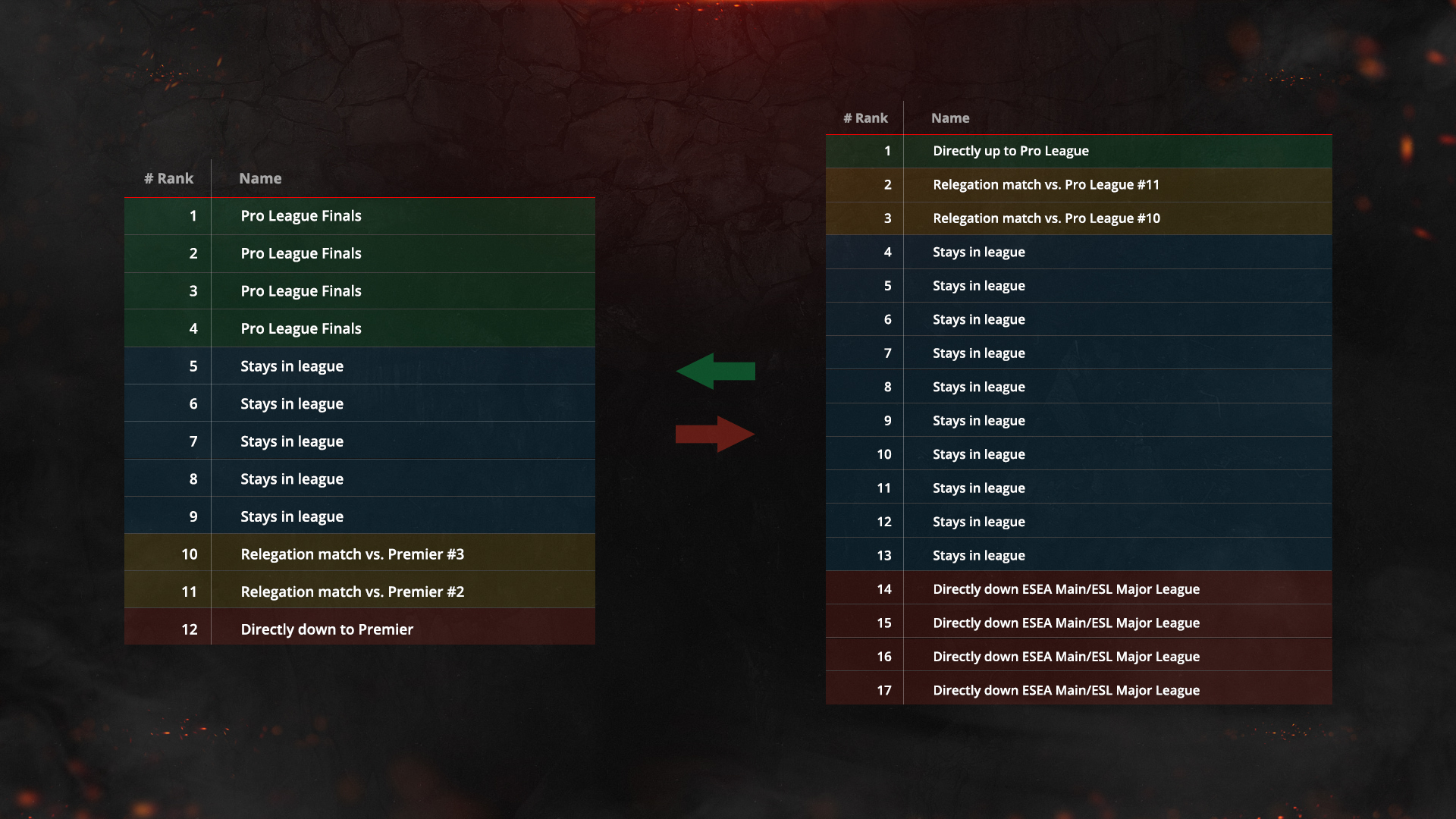 À la manière des League of Legends Championship Series (LCS), l'équipe se trouvant à la dernière position du classement à l'issue de la saison sera automatiquement reléguée au sein de la Premier Division tandis que celles qui se trouveront à la 10è et 11è place devront disputer un match de barrage contre des formations qui se sont classées 2è et 3è de la division inférieure. Par ailleurs, l'équipe victorieuse de cette seconde division sera automatiquement promue au sein de la division professionnelle tandis que les quatre moins bonnes équipes seront reversées en troisième division, l'ESL Major League ou l'ESEA Main suivant le continent.