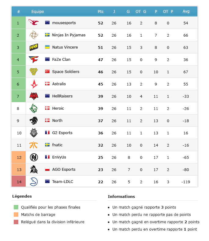 Top 6 : Faze - Astralis - G2 - Fnatic - Navi - Envyus "Ventre Mou" : Mousesport - Space Soldiers - North - Ninja In Pyjamas - Team LDLC Barragistes : Hellraiser - Heroic Relégué : AGO