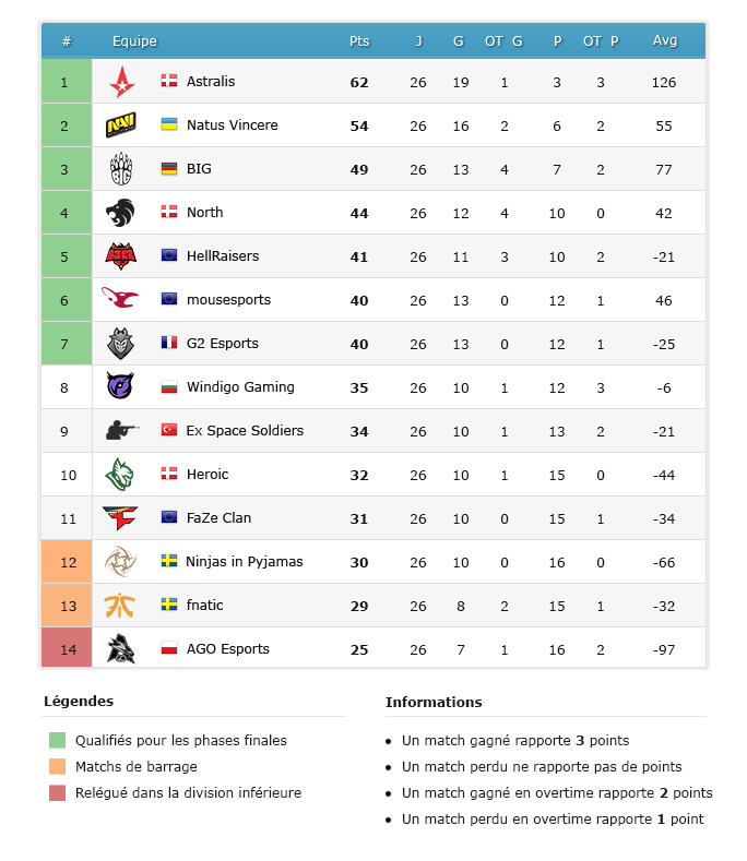 "G2 bien parti", hmm certes. Mais n'a pas joué contre Big, Navi, astralis ou North... Alors que Space soldiers a commencé par les plus forts et devrait "normalement" passer devant s'ils conservent leur bon niveau.