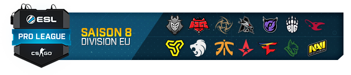 35 C'est l'heure de la huitième saison pour l'ESL Pro League ! Le format reste similaire aux éditions précédentes avec une première phase en ligne, du 2 octobre au 14 novembre, avant des finales en lan, du 4 au 9 décembre, à Odense, au Danemark. 750 000 $ seront alors mis en jeu à cette occasion. Les 14 équipes engagées côté européen s'affronteront chacune deux fois, lors de matchs allers-retours, selon le format classique du round-robin. Une fois toutes les rencontres jouées, les sept premières formations au classement seront qualifiées pour les finales ; les deux avant-dernières devront jouer les barrages de maintien ; la dernière sera automatiquement reléguée en Moutain Dew League, la division inférieure.