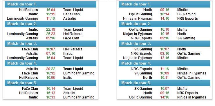 Optic groupe Rouge (choisit = choisit d'éviter / de placer cette équipe dans l'autre ) 1. Fnatic choisit SK 2. Optic choisit Faze 3. SK choisit Astralis 4. Faze choisit North 5. Astralis choisit NiP 6. North choisit Liquid 7. NiP choisit Hellraisers 8. Liquid choisit Missfits 9. Hellraisers choisit NRG 10. LG est placé ds le groupe Jaune