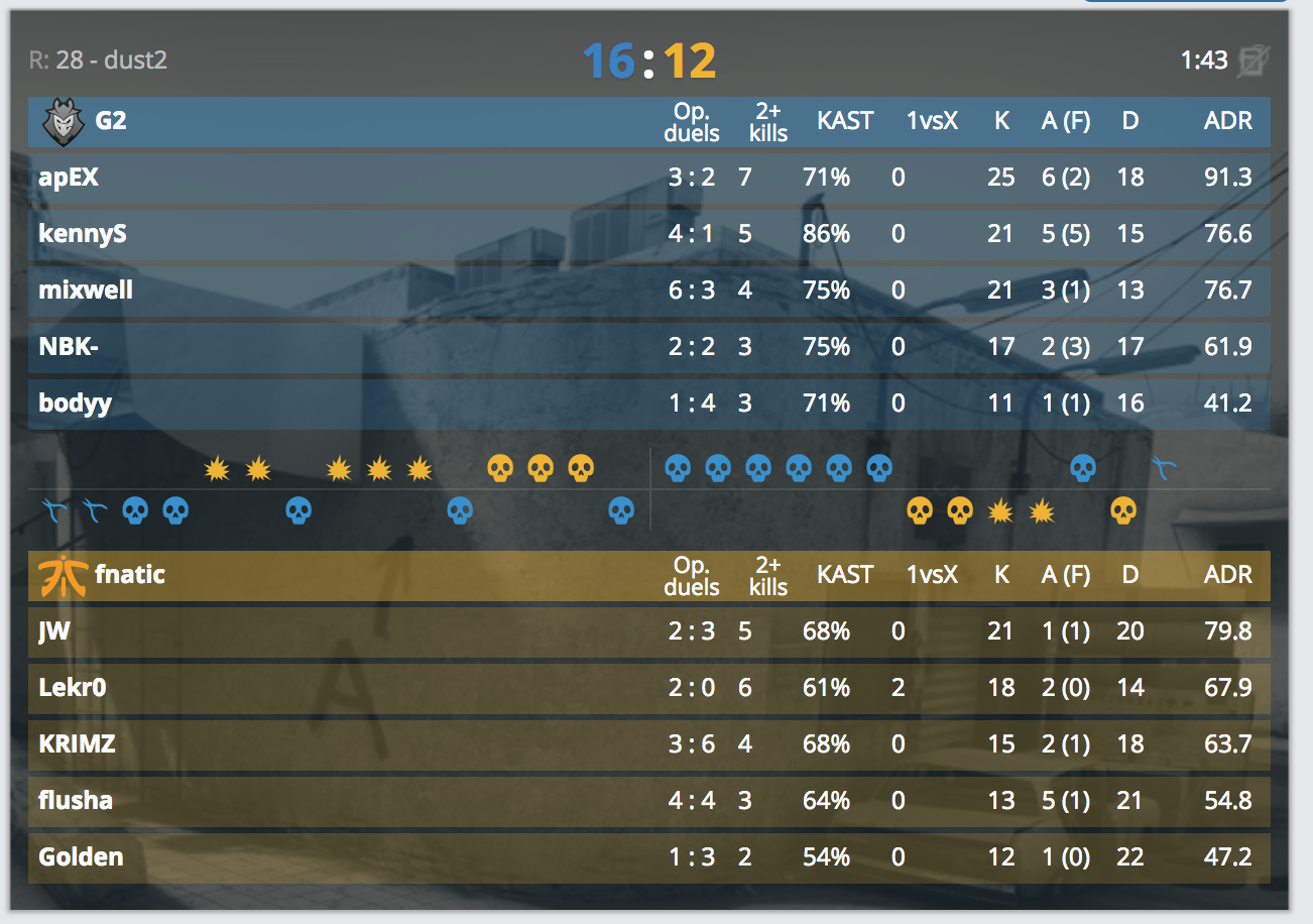 16 G2 affronte fnatic dans la demi-finale de l'upper bracket du groupe B, un match qui se déroulera en BO3. G2 choisit de jouer Dust 2 qui fait donc son grand retour dans une compétition d'envergure alors que fnatic choisit Mirage. La troisième map sera éventuellement Mirage.