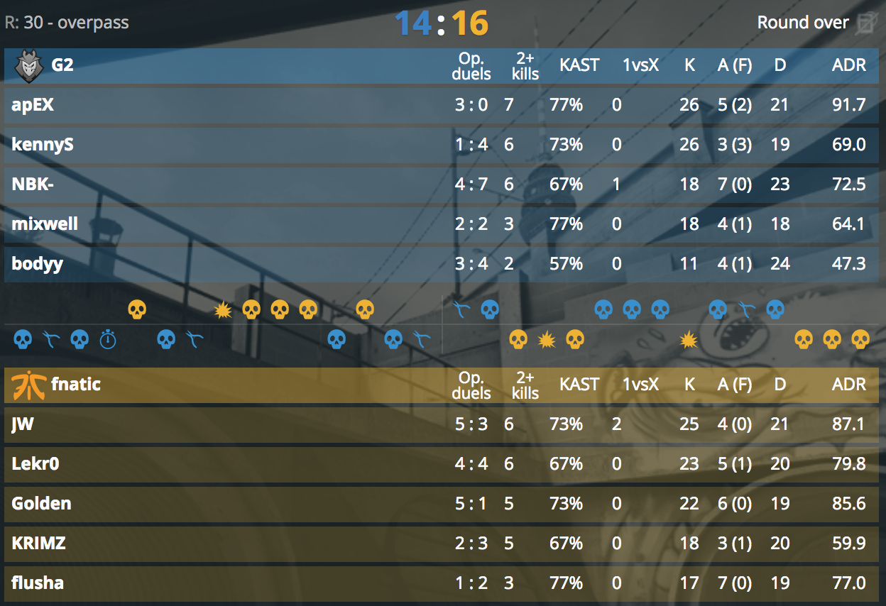 Les rounds suivants ne sont qu'une formalité pour les Suédois qui vont mener 6-1 avant que G2 ne revienne dans le match en enchaînant trois rounds, 6-4 avant que les rounds ne s'échangent et que ce premier side se termine sur le score de 9-6 à l'avantage de fnatic. Un score mal payé pour G2 qui méritait mieux :