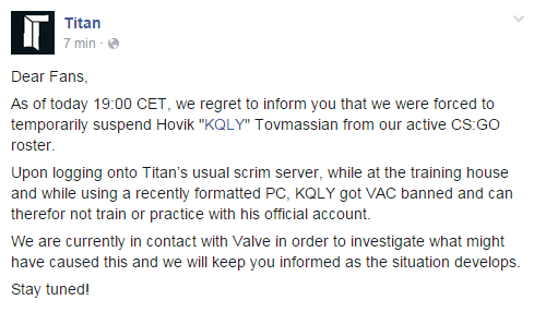 L'équipe Titan dit "être actuellement en train d'enquêter". Hovik "KQLY" Tovmassian a été suspendu de ses fonctions par précaution.