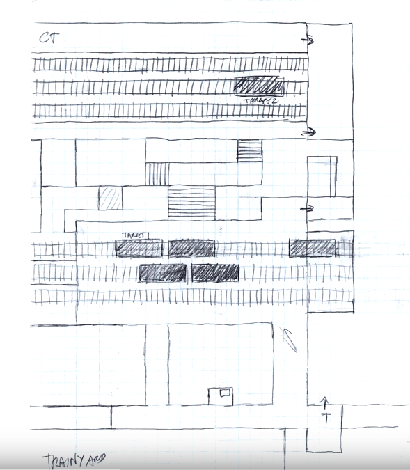 Christopher se met donc au travail et dessine d'abord l'idée qu'il se fait de Train sur papier. Dans une vidéo de 2016, 3kliksphilip avait contacté le créateur pour lui demander des précisions sur la manière dont il avait imaginé Train. Christopher lui avait alors envoyé ce schéma, fait à la main en quinze minutes, qui allait servir de base à l'une des maps compétitives les plus célèbres de l'histoire de Counter-Strike.